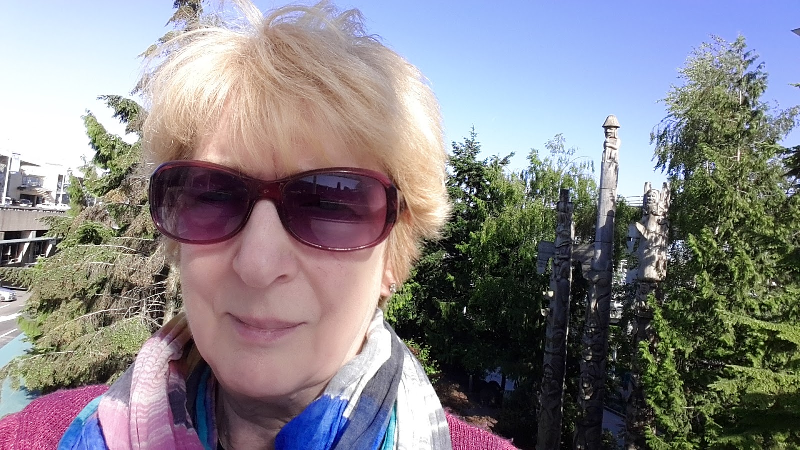 | Kathy in Vancouver Island, near totems of the coastal Salish people. |